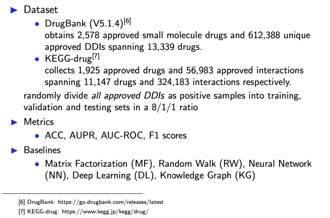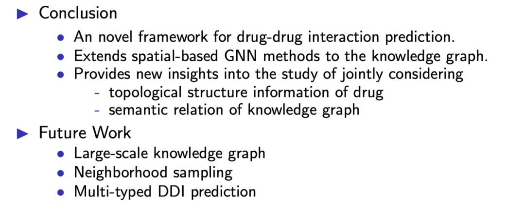 总结来说,林轩等人的工作提出了一种新颖的框架来预测DDI任务。该框架将图神经网络应用到了知识图谱当中,同时考虑了药物实体在知识图谱中的拓扑结构信息以及自身附带的语义关联信息。对于未来的工作,主要有以下几点想法:(1)考虑更大规模的知识图谱;(2)设计有效的邻域采样方法;(3)拓展到多类型的DDI预测或其他相关任务,而不是仅限于二分类预测。
