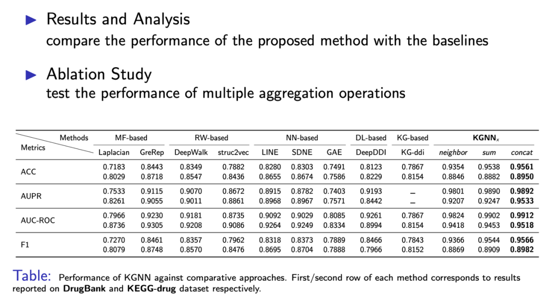 实验部分,通过DrugBank和KEGG-drug两个数据集来评估KGNN的性能。对于两个数据集,以8/1/1的比例将所有批准的DDI作为正样本随机分为训练、验证和测试集,并随机抽取正样本的补集作为负样本用于模型训练。使用多种指标评估预测性能,包括ACC、AUPR、AUC-ROC和F1分数。选取5类(MF、RW、NN、DL、KG)共9种方法作为实验基准,以更好对比实验结果。