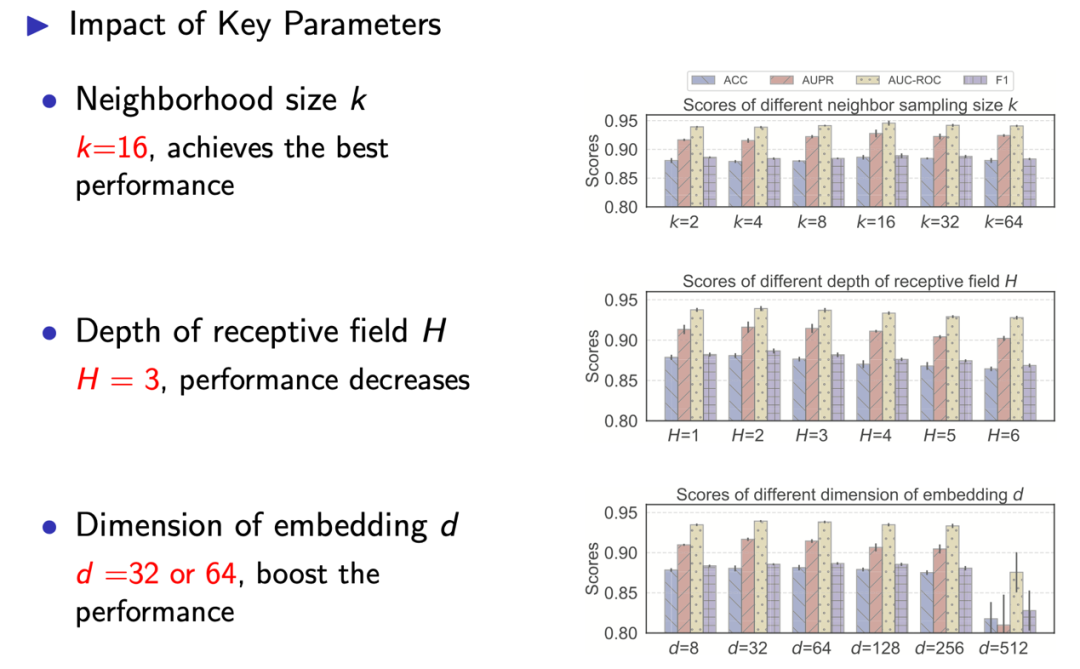实验还研究了k、H、d三个关键参数对KGNN性能的影响。首先,改变邻域大小k发现,当k=16时,KGNN可获得最佳性能。这说明如果采样的邻居节点个数太少,邻域所能够包含的信息会不够。其次,通过设置为1到6(大于6时超出系统内存)来研究感知域深度H的影响。实验结果显示,当H=2时可以学到较多的特征,但模型所有指标的性能都会从H = 3开始降低。最后,检验嵌入维度大小d的影响如设置由8变化为512。结果表明,可通过设置适当的维度大小来提高其学习能力,值过大反而会带来过拟合的情况。