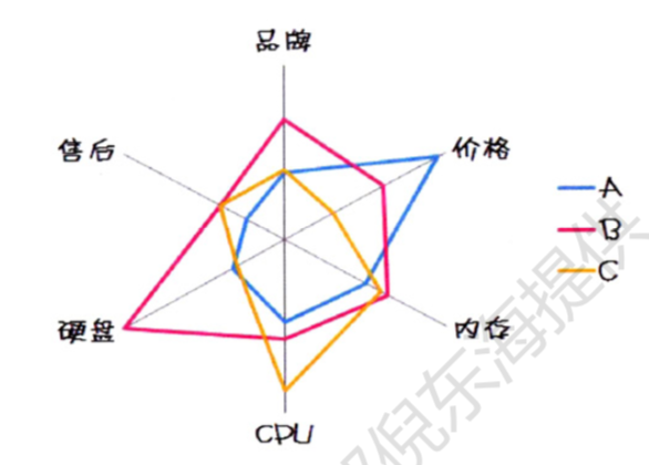 数据类型多于两个的数据分析比较。可以选择雷达图,可以对比多个类别多种指标。