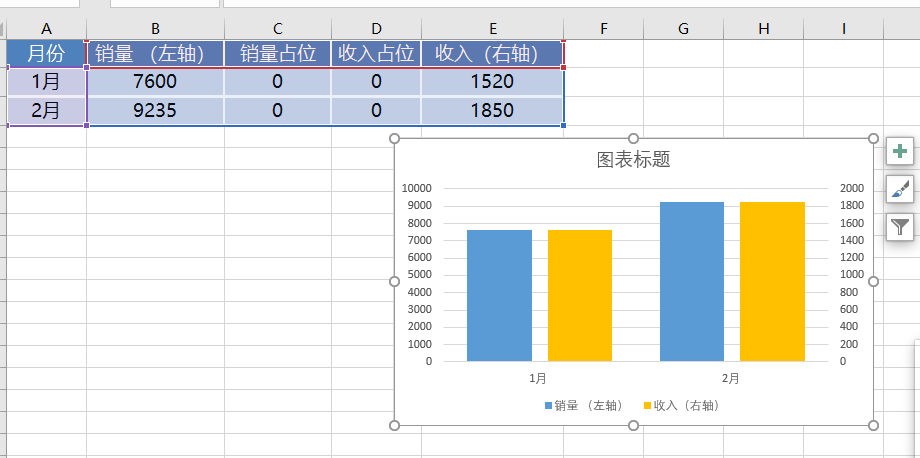 由于双柱图会导致柱子重合,可以插入销量占位和收入占位数值为0给出占位空间。