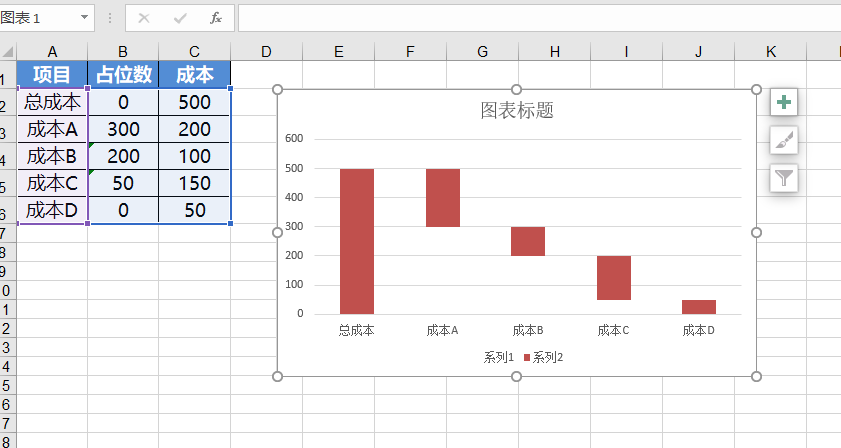 插入占位数,即差值,创建二维柱形图,设置占位数无填充颜色。