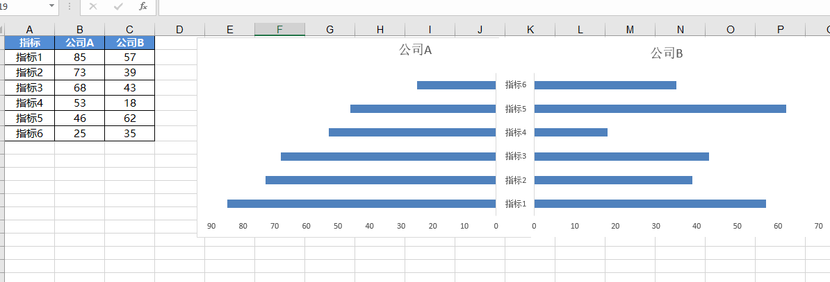 分别建两个二维条形图,将A的横坐标轴设置“逆序刻度值”,再将纵坐标轴刻度线设置为无,调整B的位置就OK了。