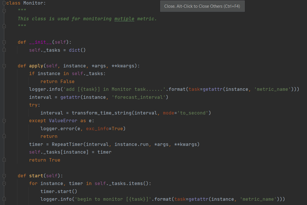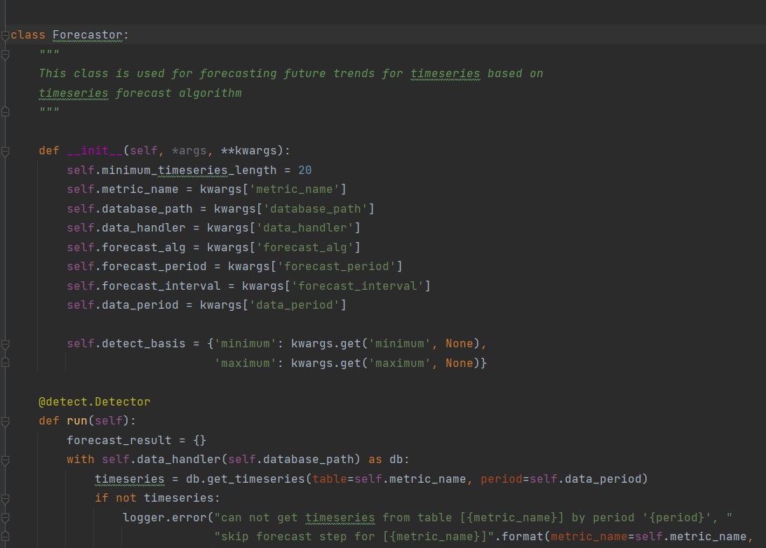异常检测当前主要支持基于时序预测的方法,包括Prophet算法(由Facebook开源的工业级时序预测算法工具)和ARIMA算法,他们分别被封装成类,供Forecaster调用。