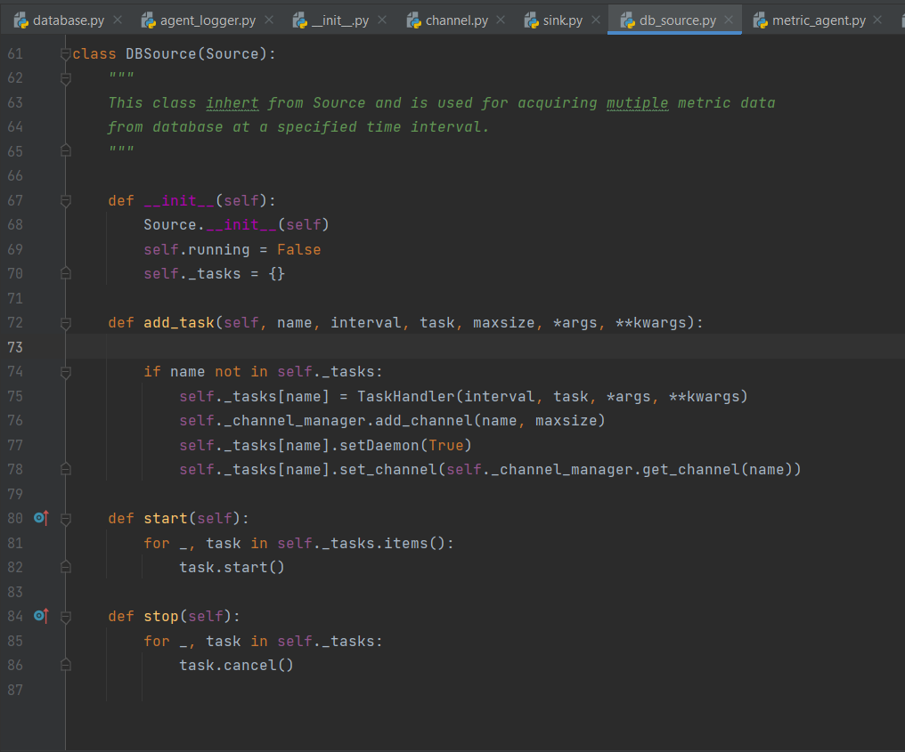 前文提到过的DBSource即派生自Source、MemoryChannel派生自Channel,HttpSink则派生自Sink。下面这段代码来自metric_agent.py,负责采集指标,在这里将上述模块串联起来了。