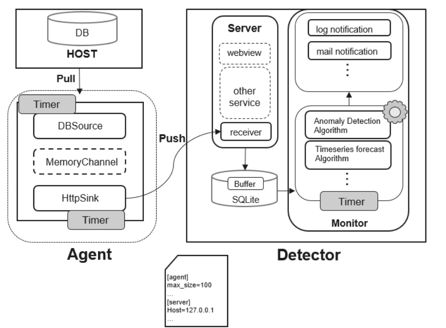 Agent将采集到的指标数据发送到Detector服务器上,并由Detector服务器负责存储。Monitor不断对存储的数据进行检查,以便提前发现异常。