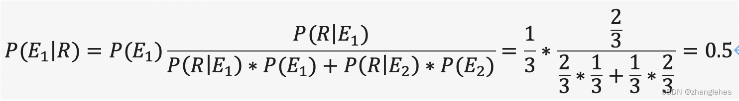 解答1: 假设从第一个盒子取球的事件为E1,则P(E1) = 1/3,假设从第二个盒子取球的事件为E2,则P(E2) = 1/3。从第一个盒子取到红球的概率P(R|E1)=2/3,从第二个盒子取到红球的概率P(R|E2)=1/3。问题是求解P(E1|R),按照公式