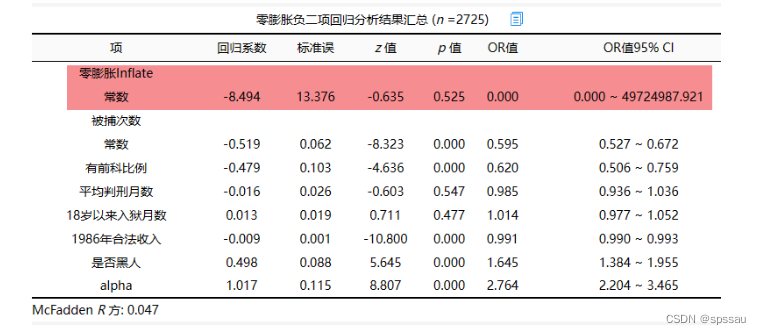 上表格展示出零膨胀泊松回归结果,首先零膨胀模型中仅列出常数值,因为本案例中零膨胀模型并没有设置影响‘被捕次数’是否为0的影响因素项。