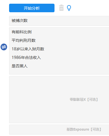 本例子中研究被捕次数的影响因素,其中影响因素包括‘有前科比例’、‘平均判邢月数’、‘18岁以来入狱月数’、‘1986年合法收’和‘是否黑人’,操作截图如下。
