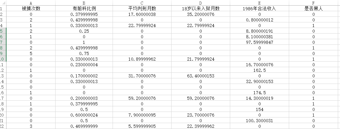 当前有一份关于美国犯罪率的研究,数据包括被捕次数,该变量为计数变量,并且包括大量的数字0(即被捕次数为0),除此之外,包括另外5个自变量,分别是‘有前科比例’、‘平均判邢月数’、‘18岁以来入狱月数’、‘1986年合法收’和‘是否黑人’,其中是否黑人这项,使用数字1表示黑人,数字0表示不是黑人。部分数据截图如下: