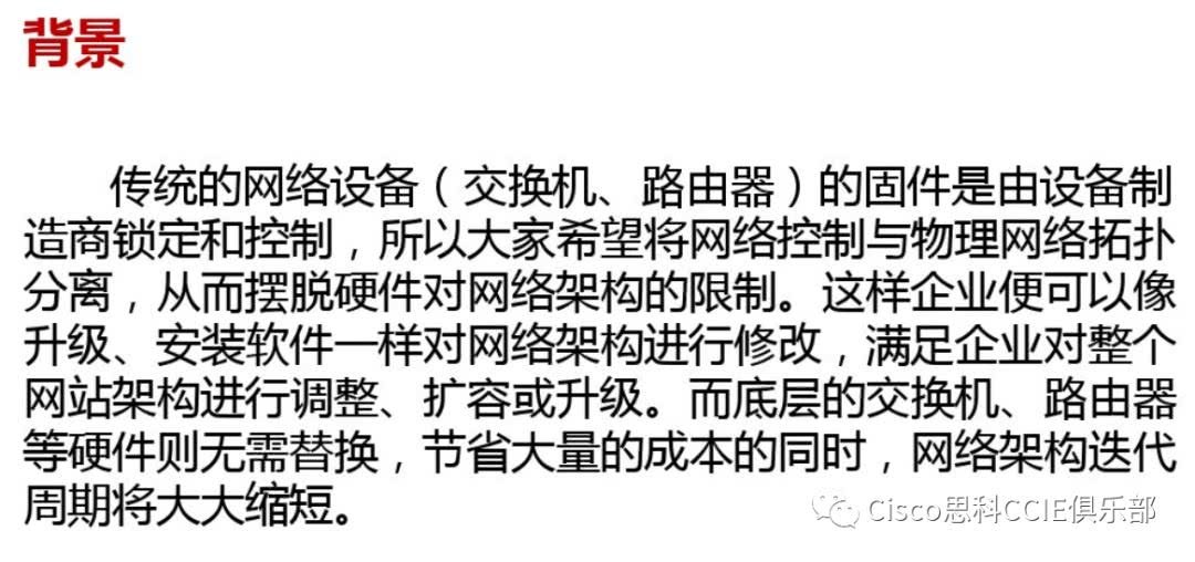 从很大程度上来说, 目前人们对网络的需求, 传统的网络不是不能满足,只是时间、资金问题而已,但这样代价太大,而且发展缓慢,为了摆脱这一困境,SDN应运而生。