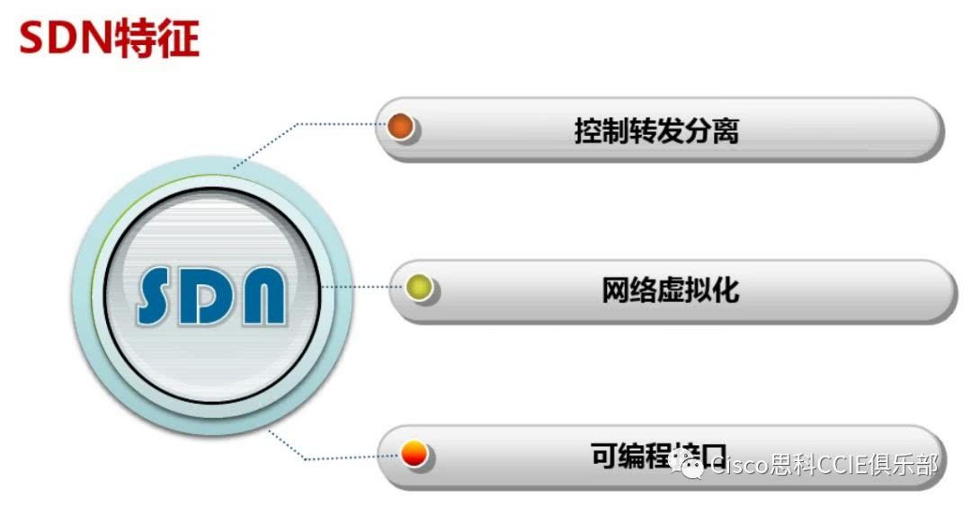 SDN最主要的特征就是数据转发和控制分离, 同时还具有网络虚拟化和开放接口等特征。