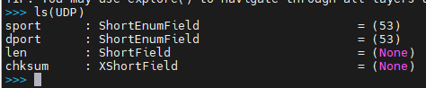 >>> ls(UDP) ##具体协议