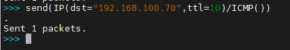 >>> send(IP(dst="192.168.100.11",ttl=10)/ICMP()) ##发送数据包