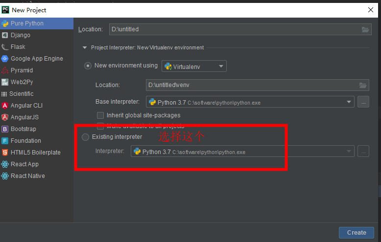 2.新建项目时,选择Existing interpreter,创建到本地,然后执行用例就OK啦