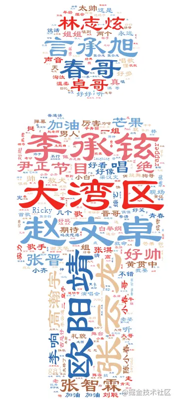 从弹幕整体词云可看到关键词最多的是大湾区(主要是指陈小春、谢天华、林晓峰、张智霖、梁汉文古惑仔组合)、赵文卓、李承铉、欧阳靖和张云龙。