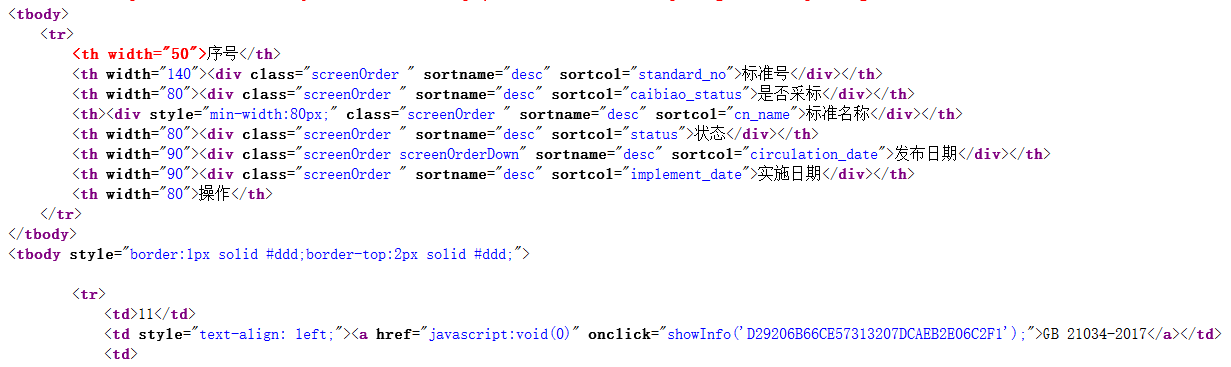 通过分析源码,可以看到在点击标准号时,通过JS的showInfo函数打开详细页面,由于JS方法传递的ID即为详细页面的参数ID,因此没必要去模拟onclick执行JS函数,直接解析到该GUID,GET请求详细页面即可。解析该GUID值,可以通过正则表达式方便的抓取到。