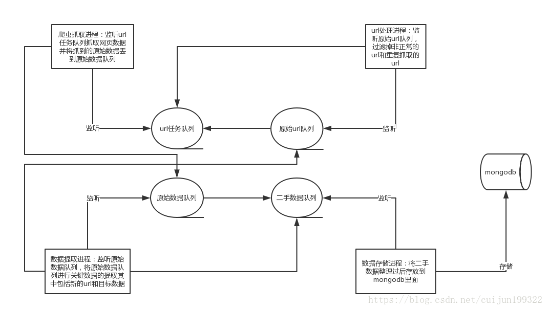 1,爬虫抓取进程--监听url任务队列,抓取网页数据并将抓到的原始数据丢到原始数据队列。