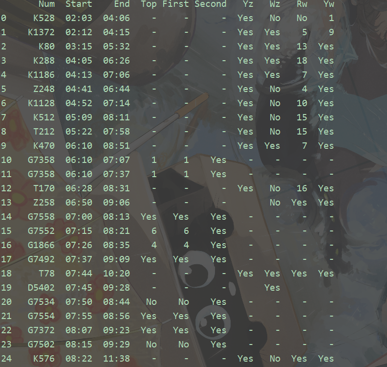 以上就是专一魔镜最近收集整理的关于Python制作一个12306查票程序脚本(附完整代码,仅供学习参考)前言首先,先导入本次所需的模块点这里即可免费在线观看请求数据自动识别编码数据解析取值实现全国车次查询再次查询/退出完整代码对于本篇文章有疑问的同学也可以点这里的全部内容,更多相关Python制作一个12306查票程序脚本(附完整代码,仅供学习参考)前言首先,先导入本次所需内容请搜索靠谱客的其他文章。