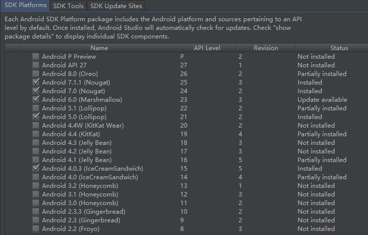 第二个,Android SDK的版本,Android SDK是Android的开发软件包,在SDKManager这里可以进行安装、升级。