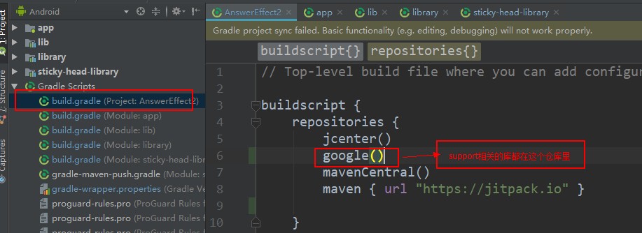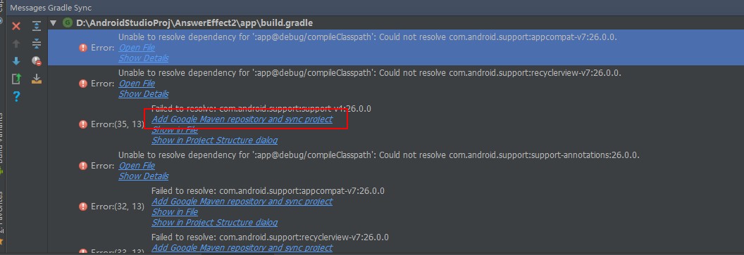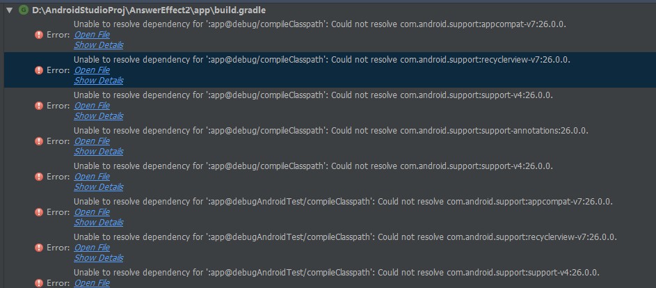 然后,就是等,等等看还有没有什么错误出现。清一色,支持库问题,这里是因为,Gradle找不到相关的依赖色去下载下载