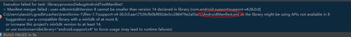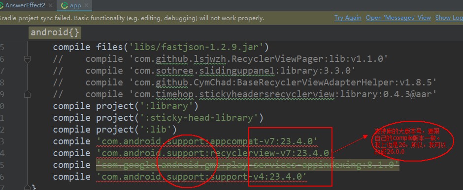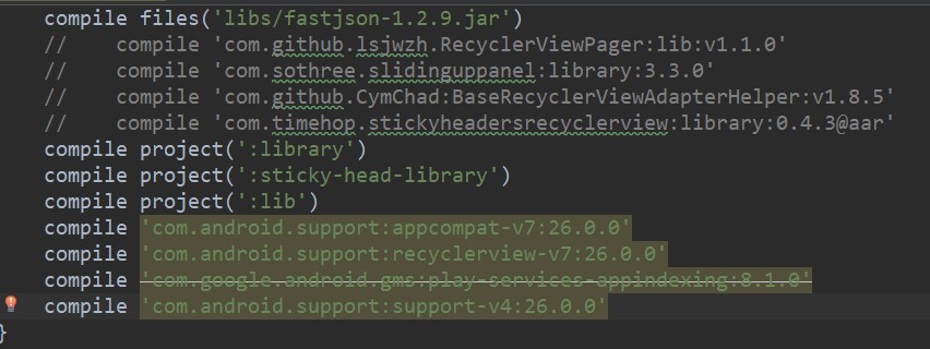 红色代表有问题,得改,支持库得跟compileSDKVersion大版本号一致,我这里填26.0.0即可