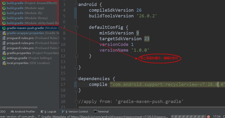 接着改每个模块的Gradle,这里compileSdkVersion 我改成 26 buildToolsVersion,即上边Build tools那里,我挑一个26.02