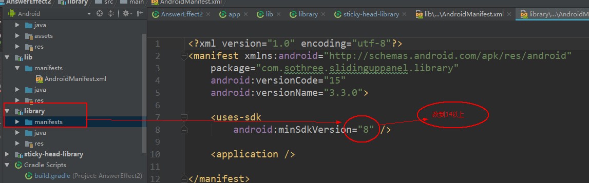 意思是把所为工程的最小SDK调到14,把所有的Gadle,改一下即可: