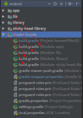 一开始没有截图,从一个工程的Gradle变多了四个Gradle,一个总工程Gradle,跑完就把本项目所有的模块的Gradle都整出来的,这是一一对应的。