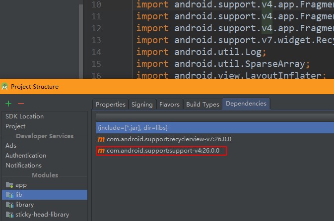 定位到该文件,然后,在该库的Gradle里添加V4支持包。没有错误了