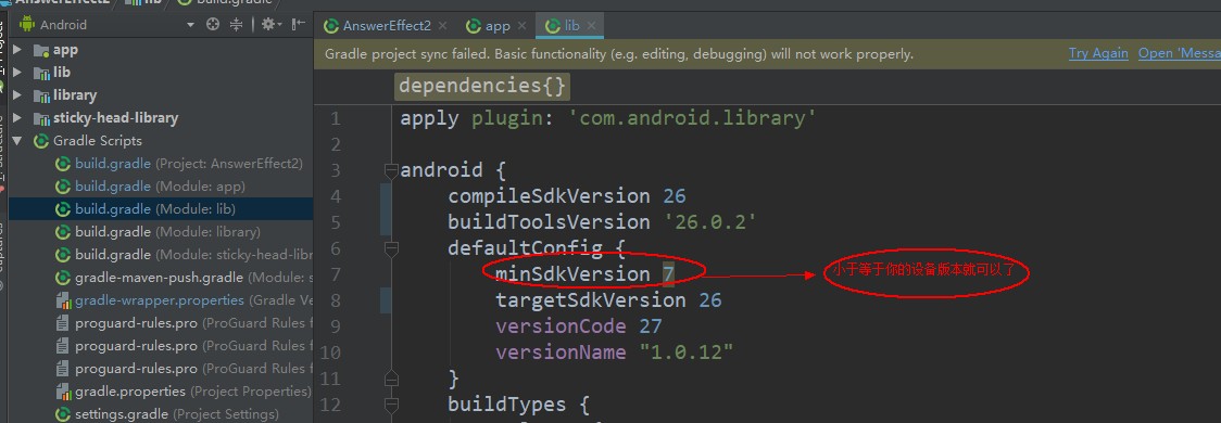 其他Gradle同样配置,有一个点就是minSDKVersion要小于等于你的设备版本。