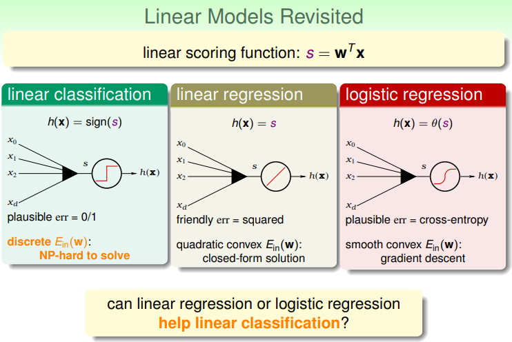 Eout0/1(w)有较小的保证。这也就意味着能够使用线性回归和逻辑回归来做线性分类的问题: