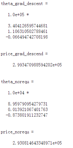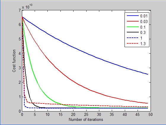 %% 方法一:梯度下降法 x = load('ex3x.dat'); y = load('ex3y.dat'); x = [ones(size(x,1),1) x]; meanx = mean(x);%求均值 sigmax = std(x);%求标准偏差 x(:,2) = (x(:,2)-meanx(2))./sigmax(2); x(:,3) = (x(:,3)-meanx(3))./sigmax(3); figure itera_num = 100; %尝试的迭代次数 sample_num = size(x,1); %训练样本的次数 alpha = [0.01, 0.03, 0.1, 0.3, 1, 1.3];%因为差不多是选取每个3倍的学习率来测试,所以直接枚举出来 plotstyle = {'b', 'r', 'g', 'k', 'b--', 'r--'}; theta_grad_descent = zeros(size(x(1,:))); for alpha_i = 1:length(alpha) %尝试看哪个学习速率最好 theta = zeros(size(x,2),1); %theta的初始值赋值为0 Jtheta = zeros(itera_num, 1); for i = 1:itera_num %计算出某个学习速率alpha下迭代itera_num次数后的参数 Jtheta(i) = (1/(2*sample_num)).*(x*theta-y)'*(x*theta-y);%Jtheta是个行向量 grad = (1/sample_num).*x'*(x*theta-y); theta = theta - alpha(alpha_i).*grad; end plot(0:49, Jtheta(1:50),char(plotstyle(alpha_i)),'LineWidth', 2)%此处一定要通过char函数来转换 hold on if(1 == alpha(alpha_i)) %通过实验发现alpha为1时效果最好,则此时的迭代后的theta值为所求的值 theta_grad_descent = theta end end legend('0.01','0.03','0.1','0.3','1','1.3'); xlabel('Number of iterations') ylabel('Cost function') %下面是预测公式 price_grad_descend = theta_grad_descent'*[1 (1650-meanx(2))/sigmax(2) (3-meanx(3)/sigmax(3))]' %%方法二:normal equations x = load('ex3x.dat'); y = load('ex3y.dat'); x = [ones(size(x,1),1) x]; theta_norequ = inv((x'*x))*x'*y price_norequ = theta_norequ'*[1 1650 3]'