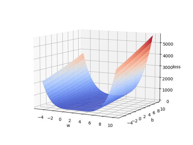 ax.plot_surface(w, b, loss, cmap=matplotlib.cm.coolwarm)