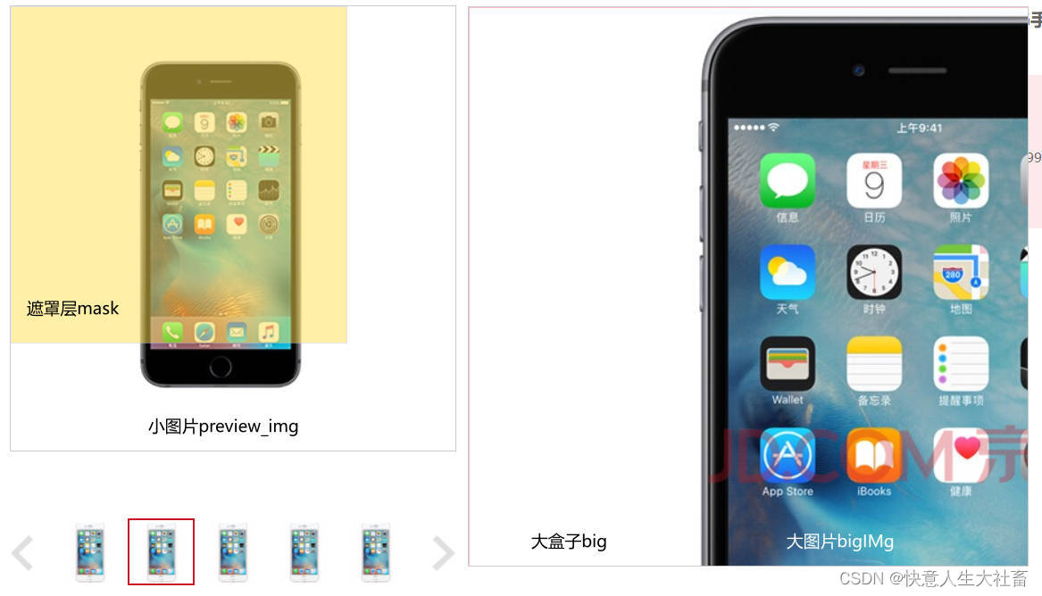 1.初始状态是黄色的遮罩层mask和大盒子big隐藏(display:none;),当鼠标经过(mouseover)小图片preview_img的区域的时候,显示(dispaly:block;)黄色的遮罩层mask和大盒子big