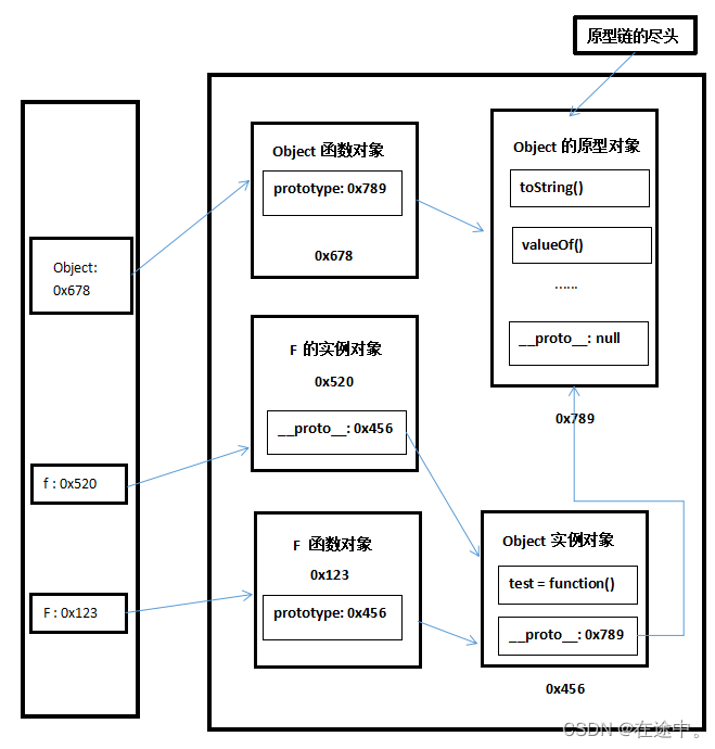 上图中Object函数对象的prototype原型对象中也是有__proto__属性的,且其值为null,所以这个原型对象就是原型链中的查找尽头。