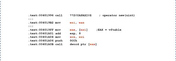 另外,我们有时还会遇到一些间接函数调用,这很可能是调用类的虚函数,当然,在静态分析的情况下(即不是在调试器中进行动态分析)如果不是事先明确的知道这个虚函数是哪个类的,要深入跟踪这个虚函数还是很困难的。我们考虑下面这个例子: