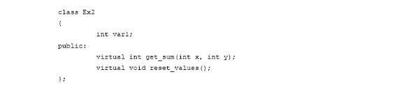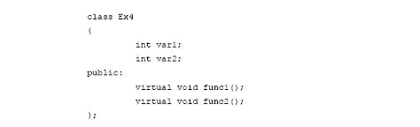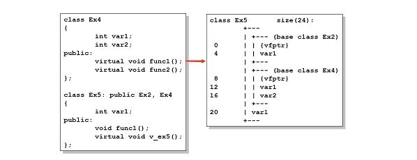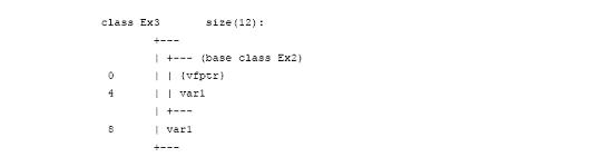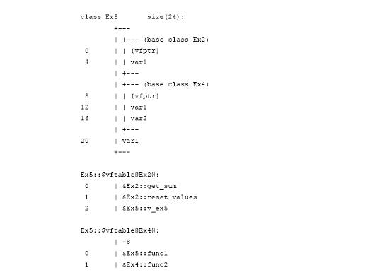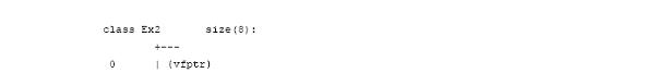 注意指向虚函数表的指针(vfptr)是被添加在最前面的,而在虚函数表里面,各个虚函数是按照其声明的顺序排列的。类 Ex2 的虚函数表如下: