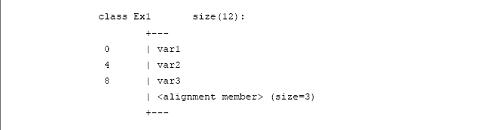 最后一个类的成员变量后面有 3 个字节的填充,这是因为要求 4 字节对齐。 在 Visual C++中,类的成员变量是按照其声明的大小依次排列在内存中的。 看 PPT 里的更清楚一点: