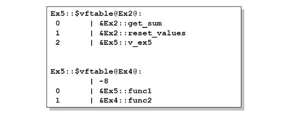 会被例在基类虚函数表的后面。另外要注意的是,因为 Ex5 中也有一个和 Ex4