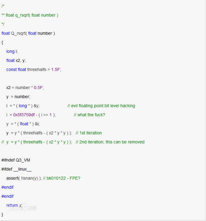 这个数字是某引擎的源代码里包括的一个反平方倒数的算法,其速度要比标准的牛顿迭代法快上 4 倍,而其中的关键是一行神秘的代码和一个莫名其妙的数字:[ i = 0x5f3759df - ( i >> 1 ); // what the fuck? ] 。代码如下: