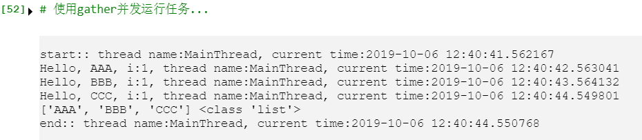 结果如下,可以看到,线程始终只有一个,名字叫MainThread,i 始终为1,所以不存在同时写变量的冲突,总时间只花费了3秒(由最长的task的执行时间决定),如果使用同步的方式来写的话,时间需要花费6秒(1+2+3)。