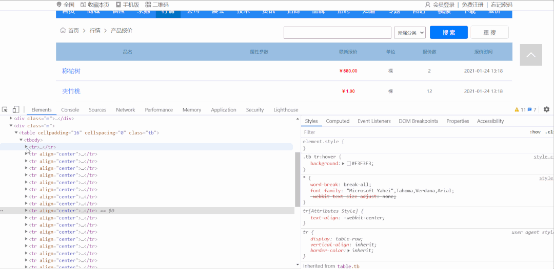 思路:每一条产品报价信息在 class 为 tb 的 table 标签下的 tbody 下的 tr 标签里,获取到所有 tr 标签的内容,然后遍历,从中提取出每一个产品品名、最新报价、单位、报价数、报价时间等信息。