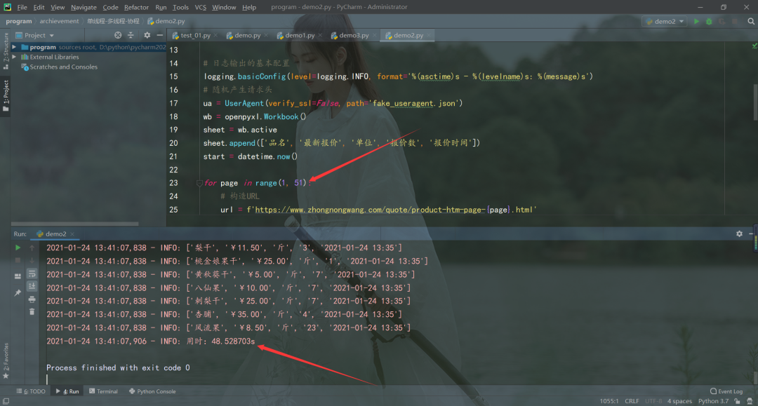 单线程爬虫必须上一个页面爬取完成才能继续爬取,还可能受当时网络状态影响,用时48.528703s,才将数据爬取完,速度比较慢。