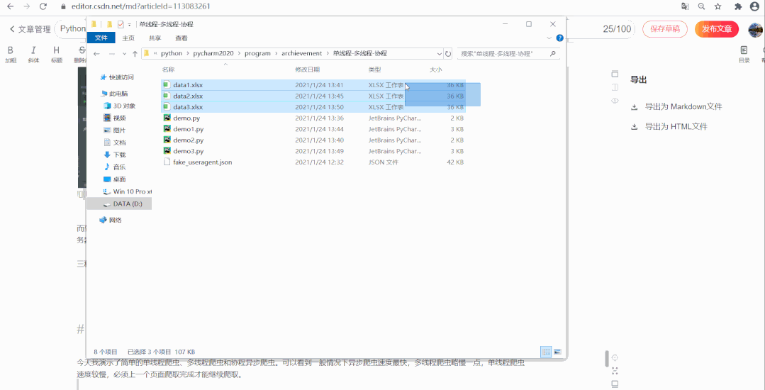 今天我演示了简单的单线程爬虫、多线程爬虫和协程异步爬虫。可以看到一般情况下异步爬虫速度最快,多线程爬虫略慢一点,单线程爬虫速度较慢,必须上一个页面爬取完成才能继续爬取。