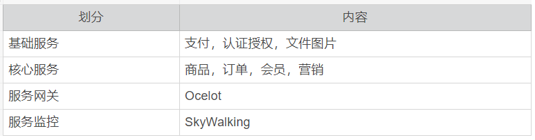 前期服务的划分,包括基础服务,核心服务,网关选型,全链路监控等技术栈。包括但不限于如下表所示: