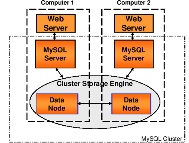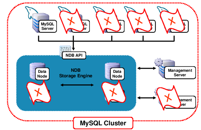 MySQL Cluster的关键部分--sql node(MySQL Server)、data node(storage或者ndbd)。至于它的结构,我们从图形来进行理解。
