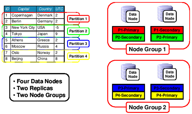 上图表述在4个数据节点的情况下,拆分一个表的存储。左上是一张表,字段是ID、CAPITAL、COUNTRY、UTC。目前MySQL Cluster是根据数据节点的个数,和replica的个数(即冗余的份数),对主键进行HASH,分布存储到各个节点中。每一个组的成员个数与replica的个数相同。