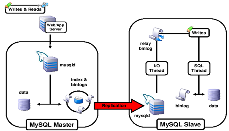 两个MySQL服务器,一个为Master(主),一个为Slave(从)。master开启二进制日志;slave启动一个线程连接master,来不断地获取master的二进制日志,并写到本地的relay binlog文件中;slave启动另一个线程把reIay binlog文件中的日志应用到slave数据库中;master中有一个线程负责与slave通讯,不断的读取二进制日志,并传递给slave。