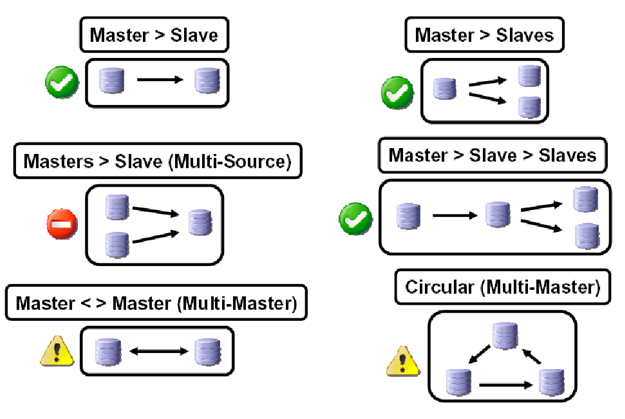 一个master可以带多个slave;一个slave只能有一个master;slave也同时可以作为master,从而形成链式复制、双向复制、环式复制。但双向复制和环式复制,在官方文档中并不提倡,因为容易产生冲突,冲突之后也没有自动解决的机制。